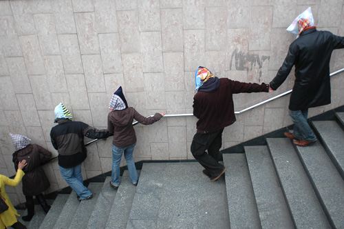 Responding to an invitation by Krytyka Polityczna, on October 4, 2007, a group of 10 individuals, chiefly the periodical’s editors, went with the artist on a walk through Warsaw. The participants wore hoods on their heads that made seeing anything or orienting oneself in space virtually impossible, and headphones on their ears transmitting somewhat modified sounds from the outside. They walked at a very slow pace, holding their hands, led by the artist. Usually they went in a long line that was broken by whatever obstacle they encountered on their way, such as underpass stairs or road barriers. The route went from Krytyka Polityczna’s offices on Chmielna street, through the crosswalk under Marszałkowska street, the park near the Palace of Culture, up to Emilii Plater street, where the participants stopped for a moment by Intercontinental Hotel. Then the group entered the hotel, went to the service lift and rode to the 36th floor. The last ten floors they went up the stairs. The biggest problem was to access the roof, the way led down narrow corridors, past the servers, past all kinds of machinery, up to a small door. The door was placed so high you had to make a large step downwards to touch the roof with your feet, after which you had to negotiate a knee-height protective barrier. When all the participants were safely on the roof, they were asked to take off their hoods, and they saw the panorama of Warsaw spread before their eyes. My first intuition was the desire to see the Krytyka people in a context different than the editorial offices on Chmielna – to see their relationships provoked by conditions different than usual – without the hierarchy, without the editorial context, in an extreme situation. I myself wanted to reduce the distance that still, despite our collaboration, separates me from them. I’m thinking here of direct, powerful, outright contact, which only happens when people give up all the power they have, when they become completely powerless. (…) The action’s most important aspect was precisely that state of powerlessness. The moment when people don’t know how to behave and what to do, when everyone has to invent some gestures or react instinctively to a situation for which no codes exist, which isn’t linked to any rituals or scripts. You need courage to decide to enter such a situation, to make yourself vulnerable. When it happens, people start building new relationships, start touching the vulnerable spots. Small indiscretions happen, some people start feeling apprehensive. But it is then, it seems to me, that they become truly human. (from interview for Gazeta Wyborcza)